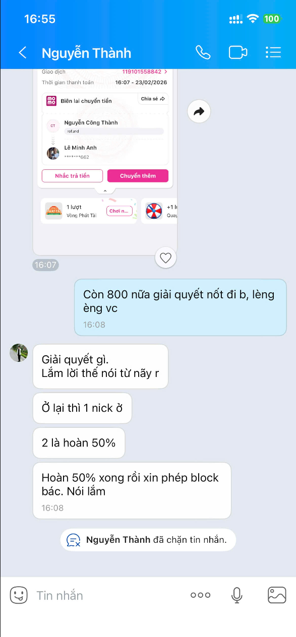 Đối tượng bán slot icloud, tôi mua 2 slot icloud với giá đã thỏa thuận là 1.600.000đ cho 2 slot. Sau khi tôi chuyển tiền, qua ngày hôm sau, đối tượng nói icloud tăng giá và tôi chỉ còn lại 1 slot( Nghĩa là tôi đang mua 1 slot với giá 1.600.000đ). Tôi không đồng ý và kêu hoàn tiền thì đối tượng nói chỉ hoàn 50% do tôi tự ý hủy. Sau đó, đối tượng chỉ chuyển lại 50% đã out hết slot của tôi ra và đã chặn tôi.