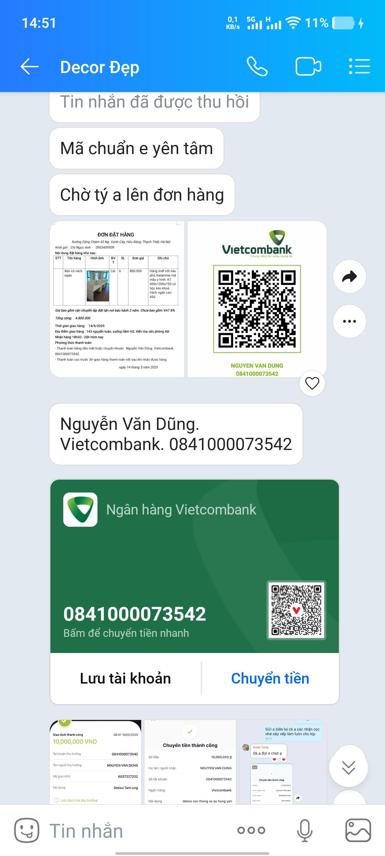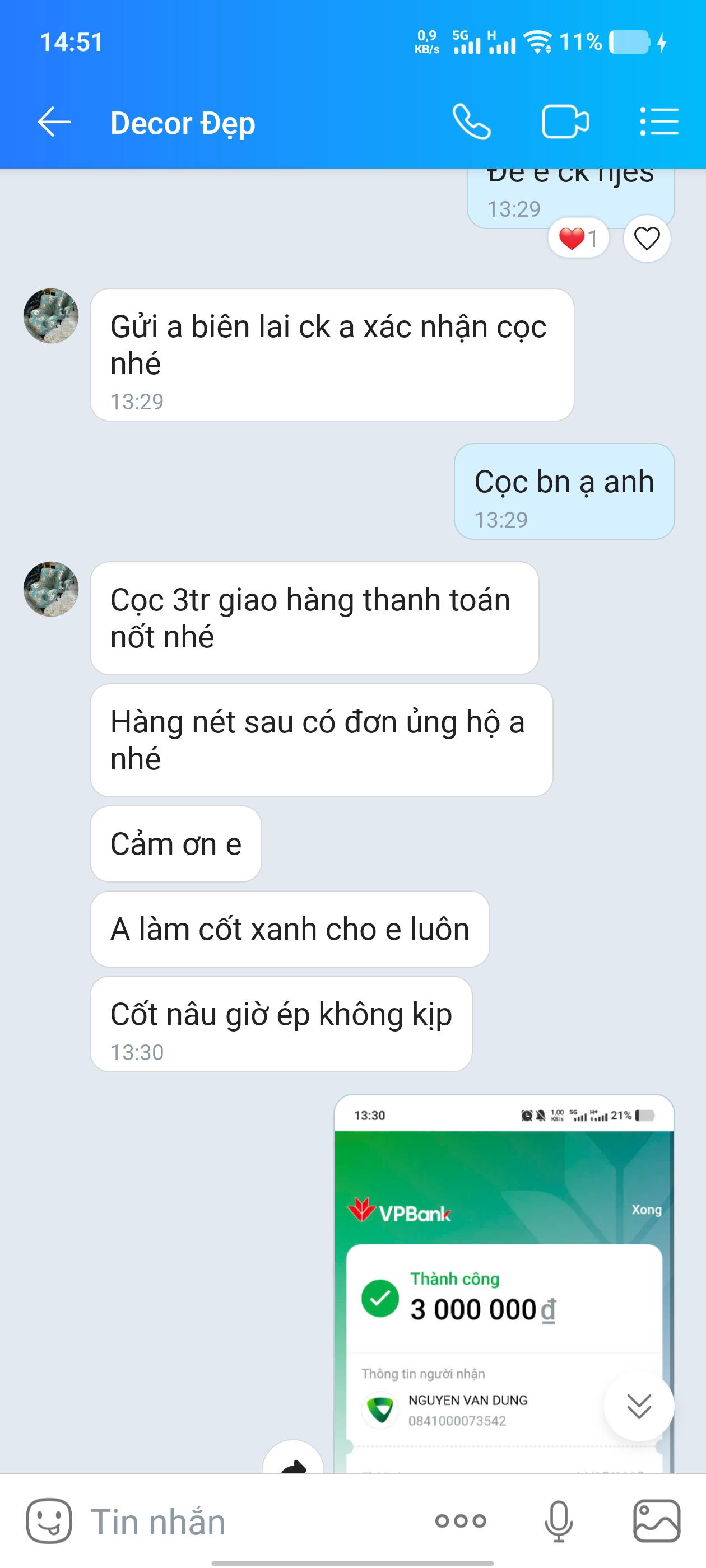 Mình vừa chuyển khoản tổng 5tr cho Fb NT Dug và Zalo Decor sdt 0924818283 để đặt bàn.